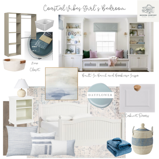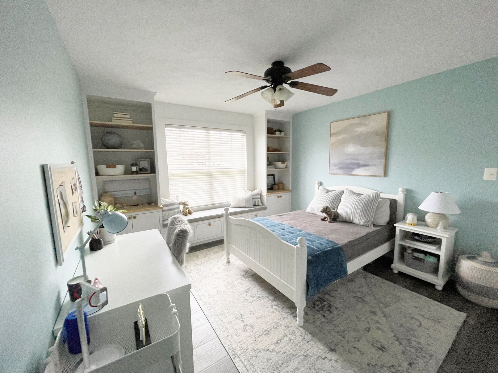 The theme was subtle coastal vibes. Design included new floors, paint and this beautiful built-in bench and bookcases that were built.