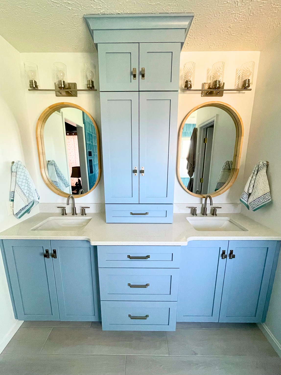 At the client's request, the goal was to enlarge the shower, update the tub and give them added storage space. They were also not afraid of color!