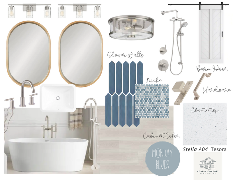 The theme for this renovation was modern coastal farmhouse. A combination of their existing furniture was used while adding some new pieces to create this wonderful cozy space. New floors, shiplapped walls, paint and decor were used in the bedroom. In the bathroom the shower was doubled, new hexagon tile floors, a larger sized subway tile for the shower walls with a dark contrasting grout and a custom vanity was built for the space in a gorgeous shade of blue green.